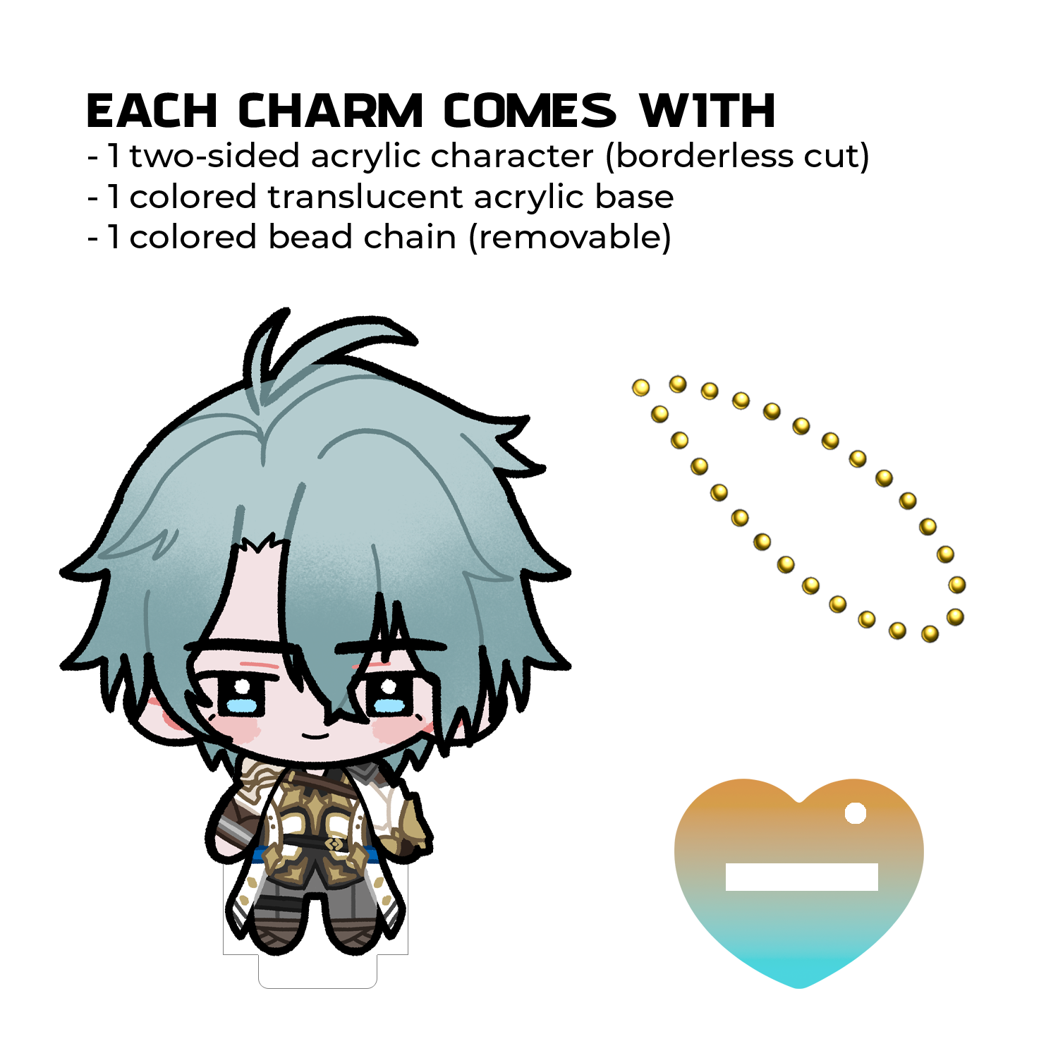 – Materials: double sided printed acrylic, borderless cut, silver bead chain